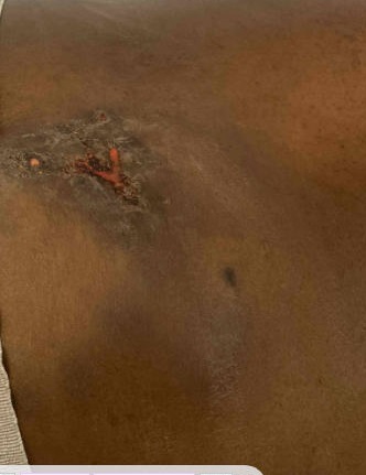 A 26-year-old otherwise healthy man, originally from Ethiopia and having recently immigrated from Kenya to Canada, presented with increasing pain, swelling, and discharge from a chronic wound to his lower back. The symptoms had persisted for years following childhood trauma from falling into a well. No formal wound care was sought at the time, and he experienced chronic discomfort and intermittent drainage. He had no other significant past medical history and was not immuno-compromised. He underwent multiple debridement and antibiotic courses in Kenya without resolution. Nine months after arriving in Canada, he presented to an emergency department for worsening symptoms. Three months prior to his emergency visit, he was evaluated by his family physician, and underwent MRI imaging, which revealed a multiloculated subcutaneous collection without bony involvement measuring 11.6cm x 11.8cm x 3.7 cm (Fig 1A). He received clarithromycin for a presumed chronic hematoma or seroma. However, symptoms persisted, prompting his presentation to acute care.