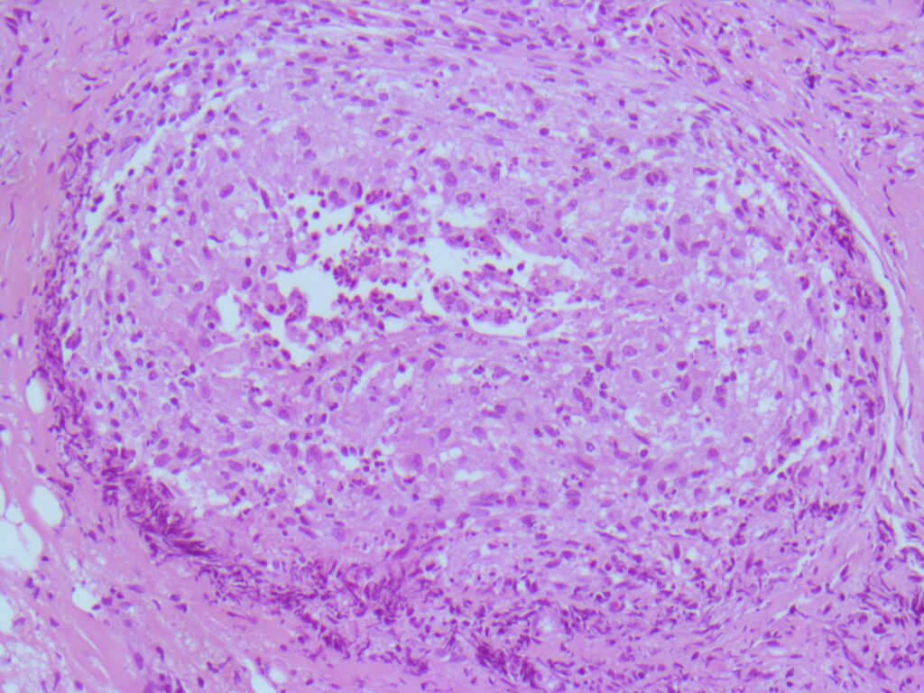 Histopathology: Evaluation using H&E and GMS staining revealed granulomatous inflammation (Fig 2), with septate, acutely branching fungal hyphae embedded in fibrinous material.