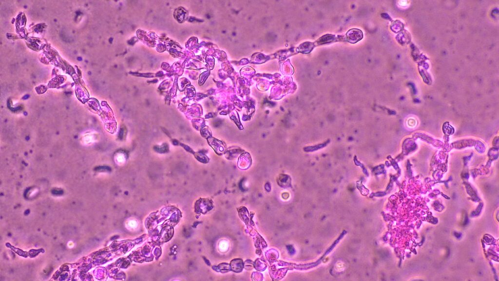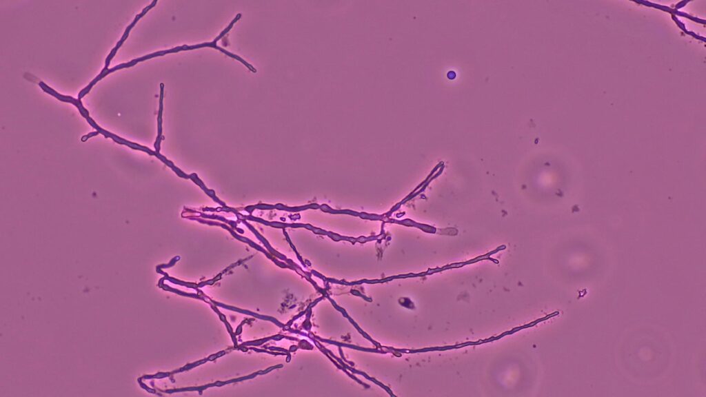 - Tape mount: Short septate hyphae (some thin, with dark pigment) with toruloid forms and abundant chlamydospores (Fig 4)